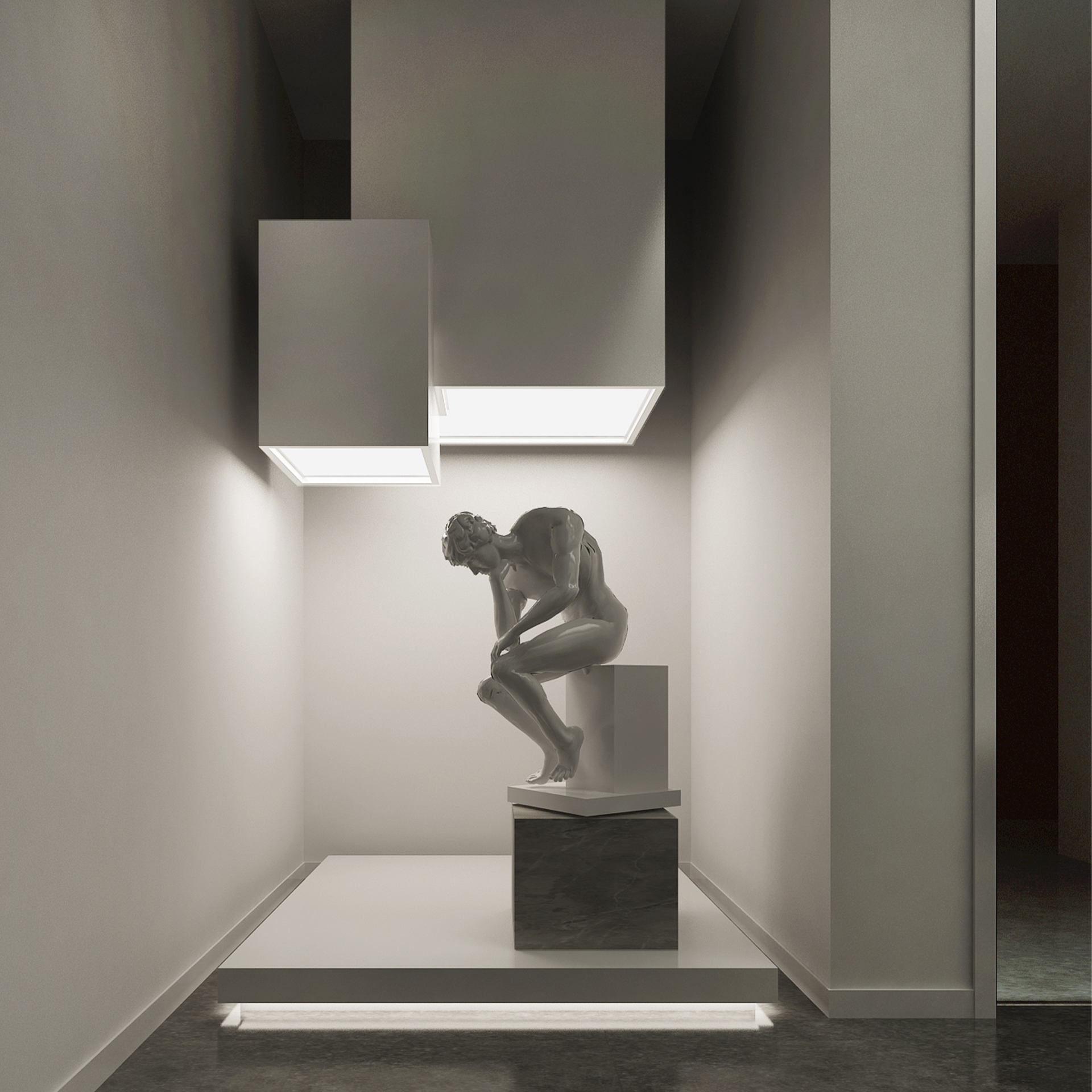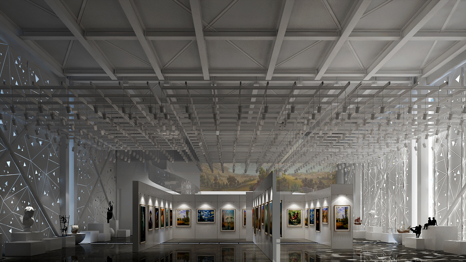 展館主要呈現(xiàn)黑白灰三色,黑白灰的色彩具有很高的審美價(jià)值,他們相互襯托,對(duì)比強(qiáng)烈,混合作用后會(huì)產(chǎn)生意想不到的藝術(shù)效果,產(chǎn)生千姿百態(tài)的節(jié)奏,極其富有韻律感和美感。這樣的空間不僅充滿情調(diào),更能襯托期間多彩的藝術(shù)品、豐富的畫(huà)作和內(nèi)涵的雕塑。